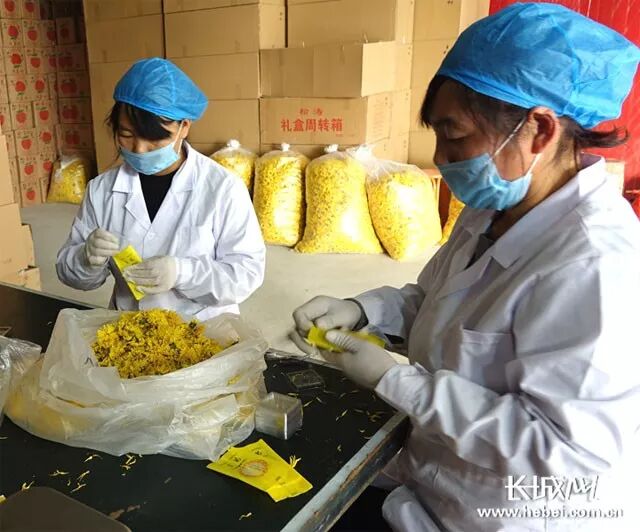 “沙河水乡”现代农业园区皇菊花加工车间内,工人正在包装皇菊花茶。 记者 吴新光 摄
