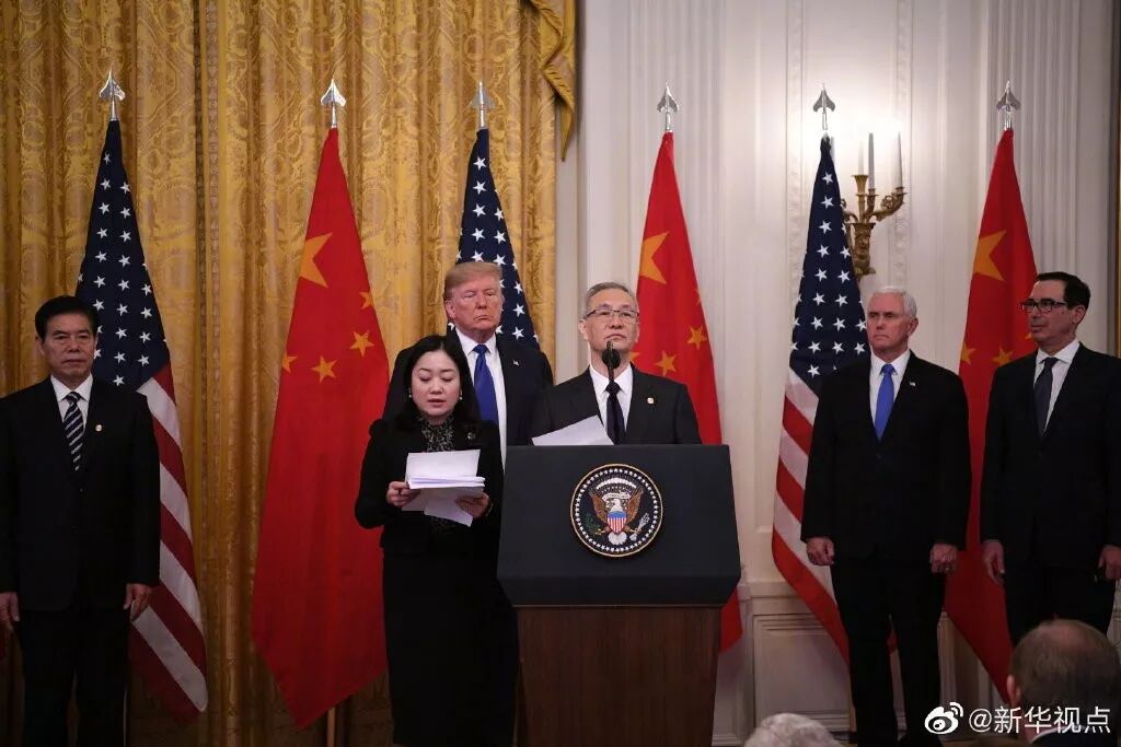 当地时间1月15日上午,中美第一阶段经贸协议签署仪式在美国白宫东厅举行。中共中央政治局委员、国务院副总理、中美全面经济对话中方牵头人刘鹤与美国总统特朗普共同签署协议文本并致辞。