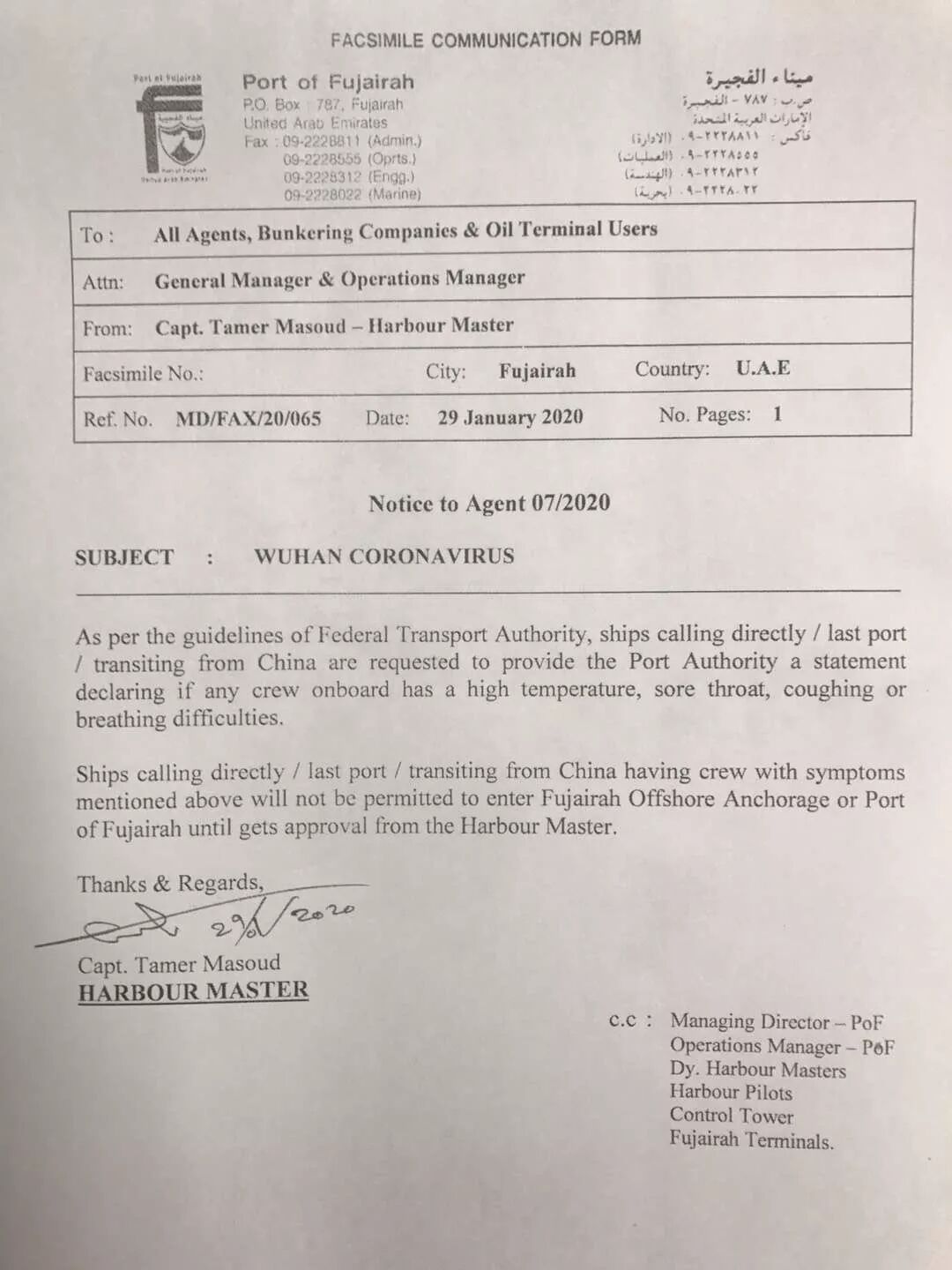 在1月24日新加坡海事及港口管理局MPA在的一份通函中表示,作为应对新型冠状病毒肺炎发展的政府措施的一部分,MPA从2020年1月24日1200起,在所有海上关卡,包括渡轮和邮轮码头、PSA码头和裕廊港,对入境人员实施体温检测。