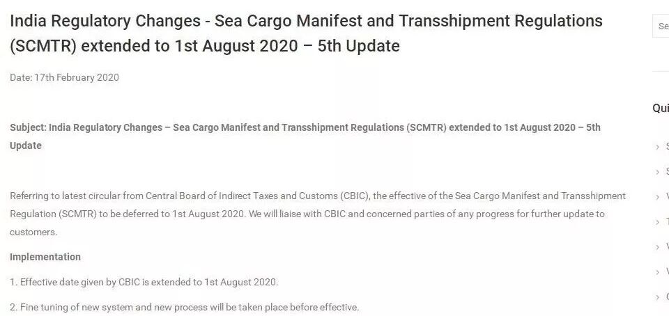 根据印度财政部、税务部和海关委员会(CBIC)的最新通告,《海运货物舱单及转运规定》 (SCMTR) 的生效日期将推迟至2020年8月1日。具体如下: