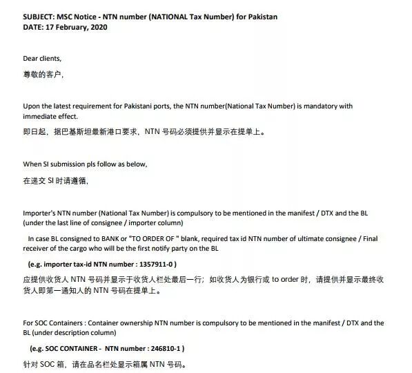 据巴基斯坦最新港口要求,NTN号码必须提供并显示在提单上。