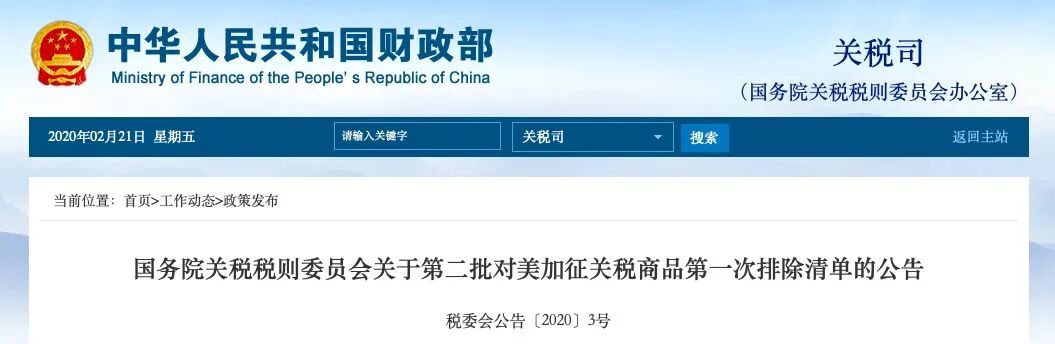 3.排除有效期本通知中宣布的产品排除加征有效期为:2018年9月24日至2020年8月7日。美国海关和边境保护局将发布有关货物进境指导和实施排除加征的指示。https://ustr.gov/sites/default/files/enforcement/301Investigations/%24200_Billion_Exclusions_Granted_February.pdf国务院关税税则委员会关于第二批对美加征关税商品第一次排除清单的公告根据《国务院关税税则委员会关于试行开展对美加征关税商品排除工作的公告》(税委会公告〔2019〕2 号),国务院关税税则委员会组织对申请主体提出的有效申请进行审核,并按程序决定,对第二批对美加征关税商品,第一次排除其中部分商品,分两个清单实施排除措施。有关事项公告如下:对清单一所列商品,自2020年2月28日至2021年2月27日(一年),不再加征我为反制美301措施所加征的关税。对已加征的关税税款予以退还,相关进口企业应自排除清单公布之日起6个月内按规定向海关申请办理。对清单二所列商品,自2020年2月28日至2021年2月27日(一年),不再加征我为反制美301措施所加征的关税。已加征的关税税款不予退还。国务院关税税则委员会将继续开展对美加征关税商品排除工作,适时公布后续批次排除清单。