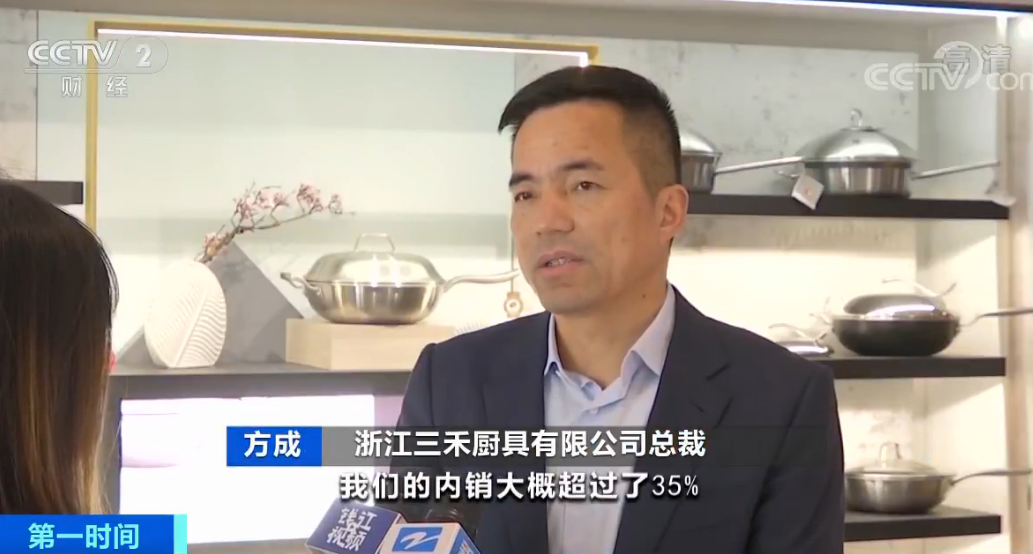浙江三禾厨具有限公司总裁 方成:在目前阶段,我们的内销大概超过了35%。今年我们对内销的期望值还是比较高的,应该是去年三倍的经营指标。