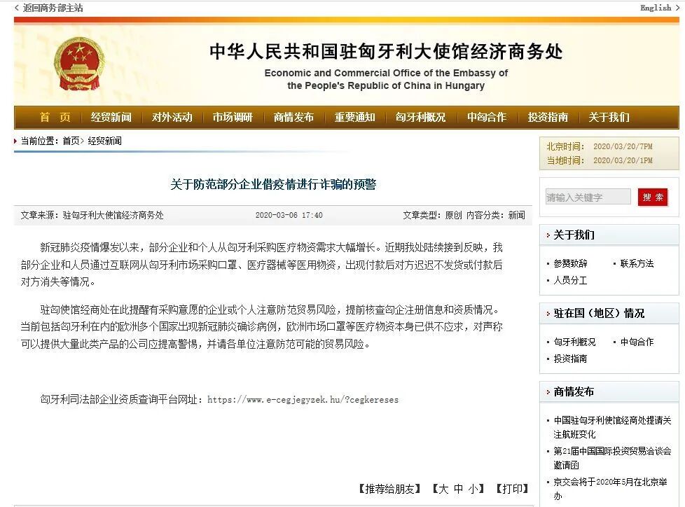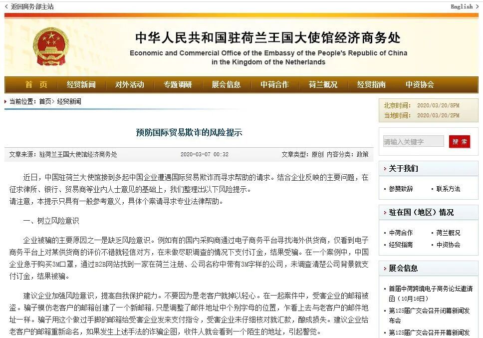 摘 要   当前新冠疫情在全球已呈现扩散蔓延态势,企业和个人防疫物资采购需求急剧增长,与此同时,趁疫情实施的国际经贸欺诈也开始集中出现。在全球疫情爆发之际,一些海外不法商家企图“浑水摸鱼”,利用出口商迫切希望拿订单、去库存的心理骗取货物。企业需高度重视,谨防疫情下的“趁火打劫”。 在抗击新冠肺炎疫情的当下,一大波“洋骗子”已磨刀霍霍,正向中国外贸企业袭来。每当中国外贸遭遇严峻的形势时,“洋骗子”们总会浑水摸鱼,让不少企业受骗,严重威胁着企业出口安全。那么,疫情之下哪些“洋骗子”会频繁出入? 01 “李鬼”冒充“李逵” 当前,新冠肺炎疫情对外贸人员出入境造成了非常大的麻烦,国内出口企业和国外进口商当面洽谈业务已经变得十分困难,只能通过电话、邮件等方式联络,给“李鬼”冒充“李逵”创造了条件。“李鬼”通常采用的伎俩,把自己说成是某知名买家的代理人或直接冒充知名买家,误导出口企业以为合同是和知名买家签订,付款责任落在知名买家身上。出口企业等事后被拖欠货款并向知名买家催款才明白,知名买家根本不是自己的买方,也无付款责任,而“李鬼”早已逃之夭夭。“李鬼”容易得逞的重要原因在于,国际贸易合同基本以签字为主,无需盖章,造假成本低,辨别难度大。 02 恶意拒收压价 新冠肺炎疫情给我国企业的复工和物流带了诸多不便,不少订单不可避免的会出现延迟交付的情况,延迟交付容易成为“洋骗子”恶意拒收的“正当理由”。“洋骗子”会要求我国出口企业大幅降价或者由“付款赎单”改成“提货后付款”,否则威胁将拒收货物。事实上,延迟交付的情况下,只要货物没有影响买家的销售,一般情况并不会成为买家拒收的理由,但一旦被“洋骗子”利用,会非常被动。对出口企业来讲,货物被拒收,会产生大额的滞港滞期费,转卖也会产生新的运费,还不一定可以顺利转卖。 03 利用贸易纠纷逃避债务 贸易纠纷一直是国际贸易中的难题,贸易纠纷甚至已经成为不少买家逃避债务的常用手段。从中国信保以往处理的案件看,买家常提的贸易纠纷包括产品质量存在瑕疵、货物迟出运等。而根据美国法律,商业贸易纠纷在官方权威机构判定前,很难给其中一方打上失信的标记。另一方面,出口企业如果选择应诉,则会面临取证难、律师和诉讼成本高的问题,这也成为买家恶意找贸易纠纷现象猖獗的原因。疫情之下,出口方的履约能力受到不同程度的影响,履约瑕疵也增加了“洋骗子”逃避债务的底气。 04 无单提货 控制提单是外贸企业管理收汇风险比较有效的手段,比较常见的是凭提单复印件付款或者通过银行交单结算。在国际贸易实务中,被买家无单提货的情况不在少数,比如出口企业拿到的可能不是船公司签发的提单,而是货代签发的提单;船公司或银行和买家串通违规操作;FOB情况下货代由买家指定等。新冠肺炎疫情对物流体系造成了比较大的冲击,使得出口企业为完成出口而改变传统的物流模式的做法或将不可避免的出现,特别是为了赶交付日期由海运改为空运,而空运单并不具备控制货权的功能。 在各国疫情愈演愈烈的背景下,一些不法企业和个人也在借助疫情催生的各种需求,实施国际经贸欺诈。我国多个驻外大使馆经济商务处纷纷发布预警信息: 图1:中华人民共和肯尼亚共和国大使馆经济商务处 图2:中华人民共和国驻匈牙利大使馆经济商务处 图3:中华人民共和国驻波兰共和国大使馆经济商务处 图4:中华人民共和国驻荷兰王国大使馆经济商务处 美国财政部金融犯罪执法网络(“ FinCEN”)也于2020年3月16日发布预警通知,警告金融机构与新冠肺炎疫情(COVID-19)相关的非法行为,特别指出当前国际经贸欺诈出现了新的发展趋势。 图5:FINANCIAL CRIMES ENFORCEMENT NETWORK 1 冒名顶替者诈骗:冒充政府机构,国际组织和医疗组织的犯罪分子,以募集捐款,窃取个人信息或分发恶意软件。 2 投资诈骗:欺诈者歪曲事实,声称上市公司的产品或服务可以预防、检测或治愈冠状病毒。 3 产品欺诈:销售未经批准或错误品牌的产品,并作出与COVID-19有关的虚假声明的公司; 或以欺诈手段销售与COVID-19相关的用品,例如口罩。 4 内幕交易:内幕交易者基于有关COVID-19对股票财务业绩有负面影响的重大非公开信息进行交易或向他人提供小费。 FinCEN建议本国金融机构“对与自然灾害后发生的恶意或欺诈性交易保持警惕”。 案例A——谨防冒用正规买家名义签约 国内A公司与肯尼亚B公司签订农化产品销售合同,并指定中国信保担保。A公司将三票货物先后发至B公司指定的蒙巴萨港口(货物的收货人在乌干达),并通过银行托收的方式将第一票货物全套正本单据交至B公司指定的乌干达银行。 但当货款已经到期,B公司既不付款也不提货。因此,A公司通过交单银行要求对方银行将全套单据退还,但对方银行退回的提单是彩色打印件,而非正本提单。但A公司通过中国信保提供的方式联系B公司时,B公司反映并没有和A公司签订合同。因此,A公司判定是有人冒充B公司与其签订了合同。 案例B——关注海外供应商货物来源 近日,某外贸集团需要从其首次接触的一家德国中间商处采购70万只医用口罩,总金额84万欧元。由于时间紧、物资缺,德国供应商要求在日内签订合同并收到全额预付款,否则无法提供防疫物资货源。得到消息,中