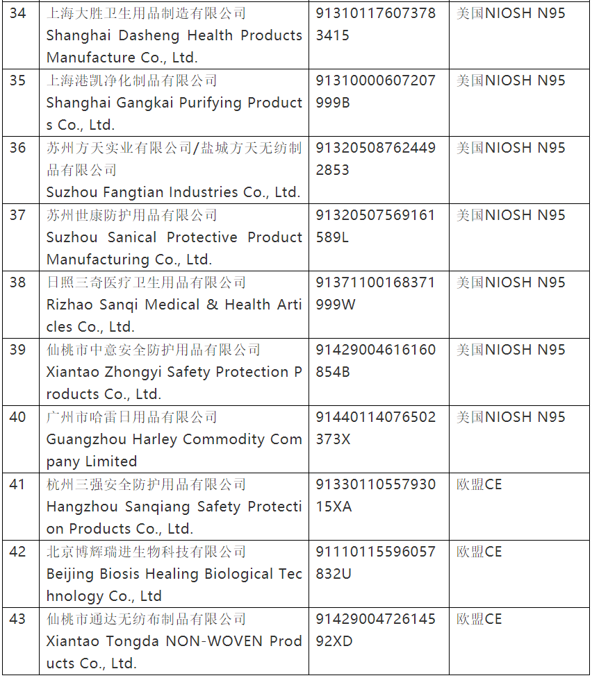 02、取得国外标准认证或注册的非医用口罩生产企业清单(43家):