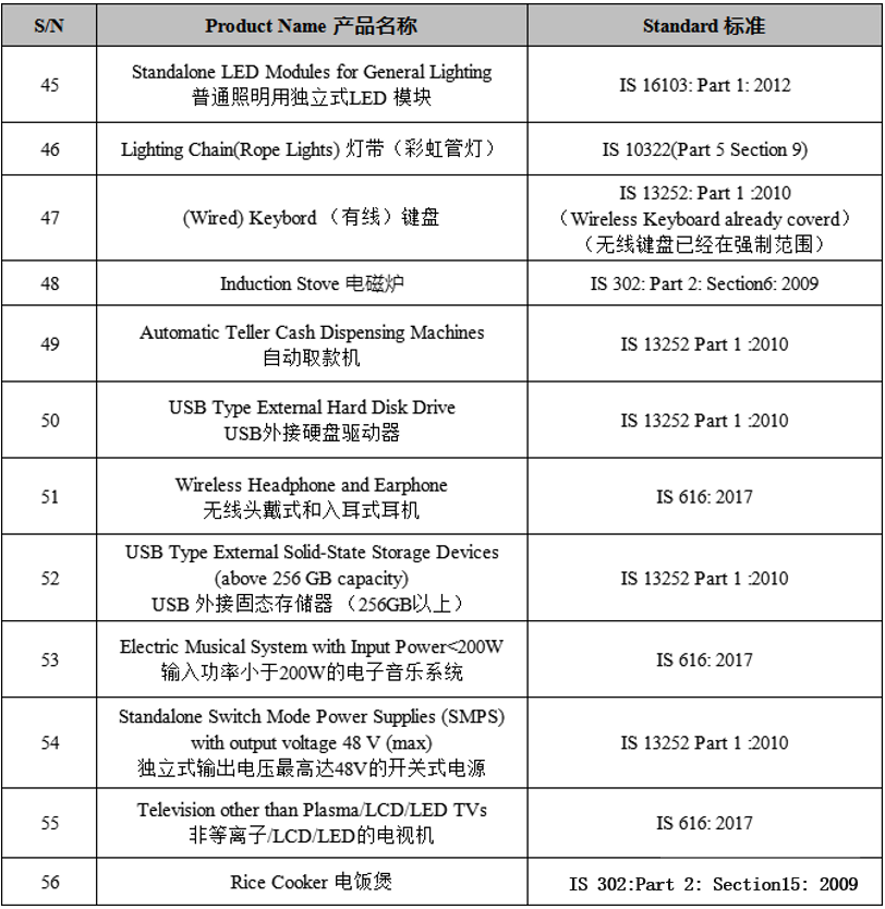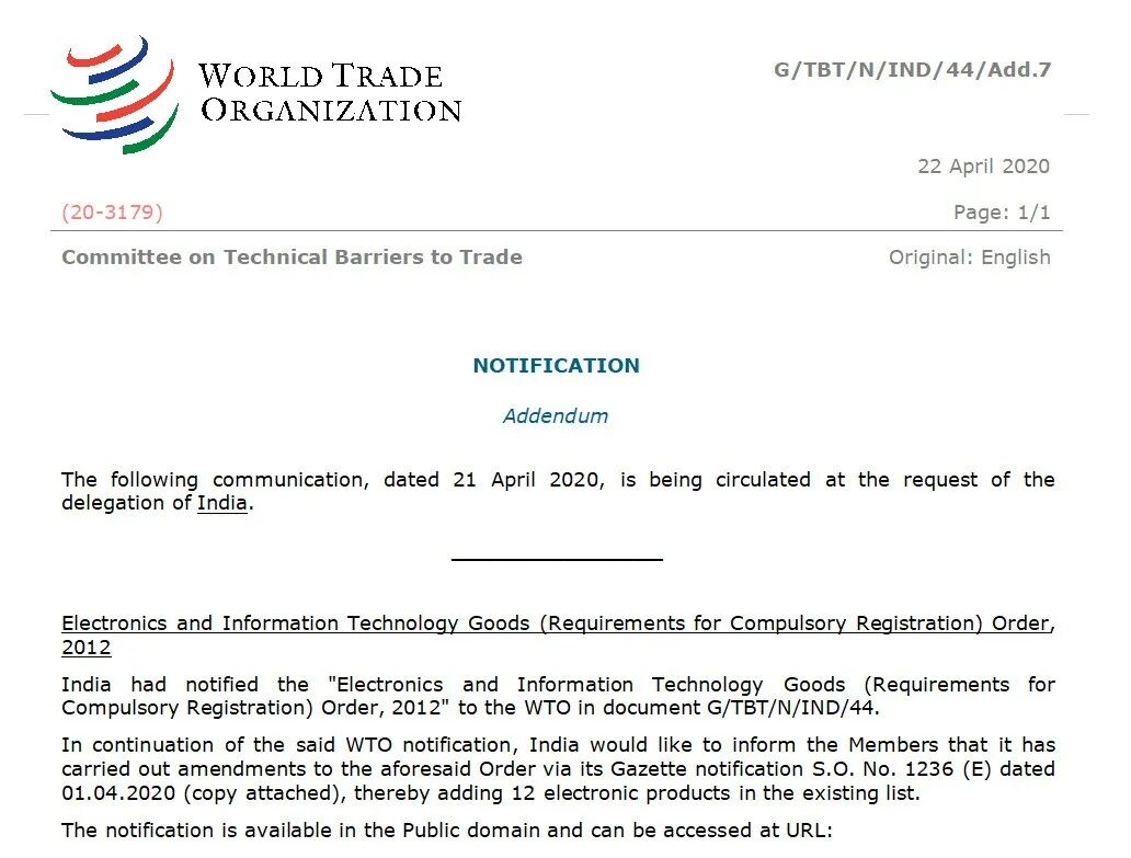 2020年4月22日,印度发布技术性贸易措施通报(通报号为G/TBT/N/IND/44/Add.7),公布第4批《电子和信息技术产品(强制注册要求)2012法令》产品目录,新增12项产品,包括2项LED灯具产品、5项信息类产品、3项影音类产品和2项家电类产品,涉及产品有照明、键盘、蓝牙耳机、USB外部硬盘驱动器、电磁炉、电饭煲等。