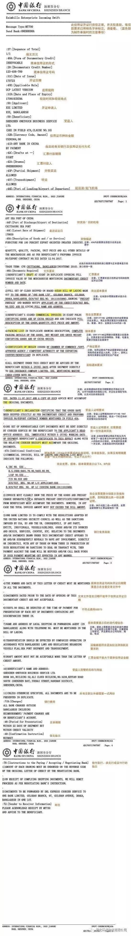 解读:这里所出现的每一条都要出具对应的文件。国外客户会将他们需要的文件基本上都显示在46A (少数的会在47A 里体现),逐条的审核单据是否能够出具。如果做不到的条款要联系买家修改,比如原产地证如果写的是MERCHANDISE ARE OF INDIA ORIGIN ,那肯定是错误的,中国出具的原产地证是MERCHANDISE ARE OF CHINA ORIGIN。